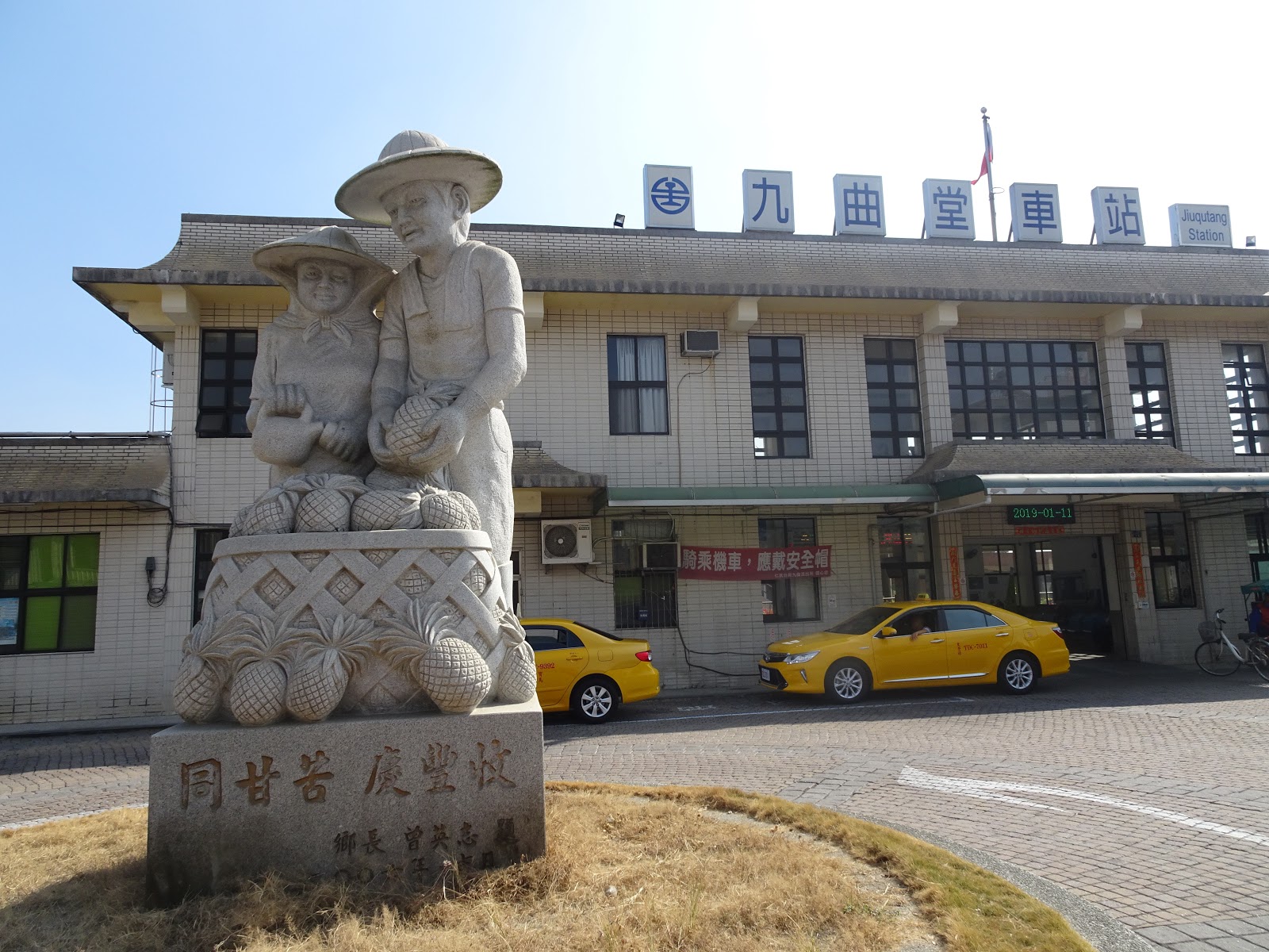 九曲堂站前有一座「同甘苦、慶豐收」的石雕