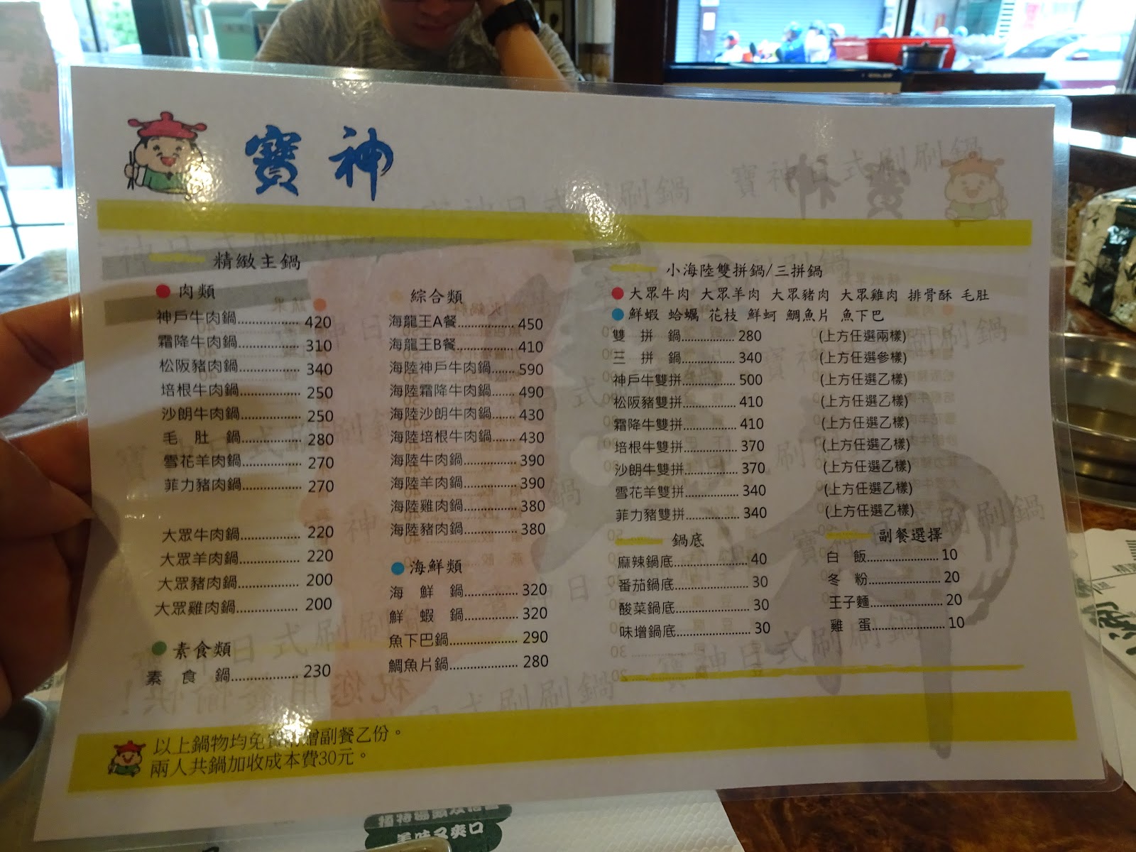 台北市北投區 - 寶神涮涮鍋(關渡店) 年假走春人潮很多,尤其是關渡宮人更是多多多,而且還有很的店家都還在休假,尋尋覓覓中剛好看到寶神涮涮鍋有營業,一進門服務員很客氣帶位,這家的甜點飲料都是無限供應,難怪用餐人潮也是很多。 地址:台北市北投區知行路260巷6號 電話:02-2858-2138 店內裝潢乾淨簡潔 菜單 一入座服務人員會先送上菜盤和湯鍋 選的豬肉鍋和雙拼鍋的主要肉類料理 全部的餐點,真的還不錯吃 冬天就是要吃火鍋最對味 餐後甜點