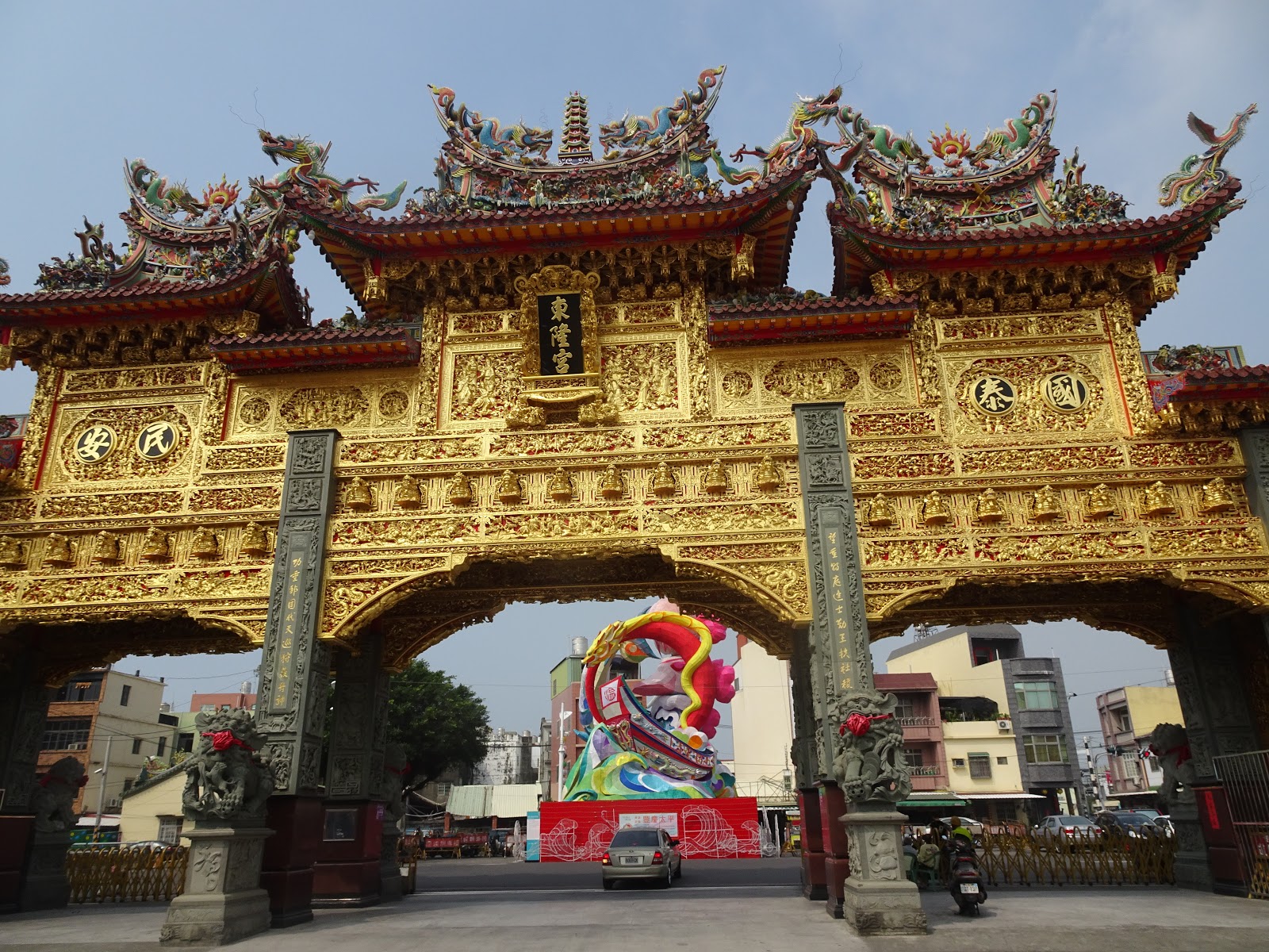 東隆宮的山門十分醒目,格局方正、金箔貼滿山門,耗資八千多萬興建,約四層樓高,主體為鋼筋水泥結構飾以石雕及安金木雕,其規模尺寸堪稱全台第一