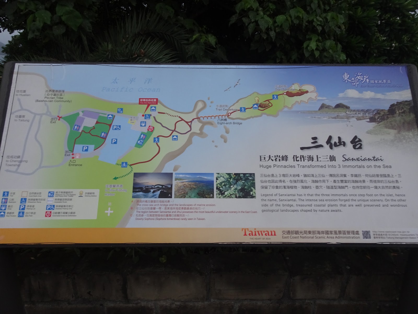 三仙台的八拱跨海大橋,造型夠眩,如長龍臥波,氣勢壯觀;島上地形景觀與生態資源極為獨特稀有,海岸植物種類繁多,是研究海岸植物生態的重要據點,可循規劃良好的步道觀賞沿途生態及地質觀賞。
