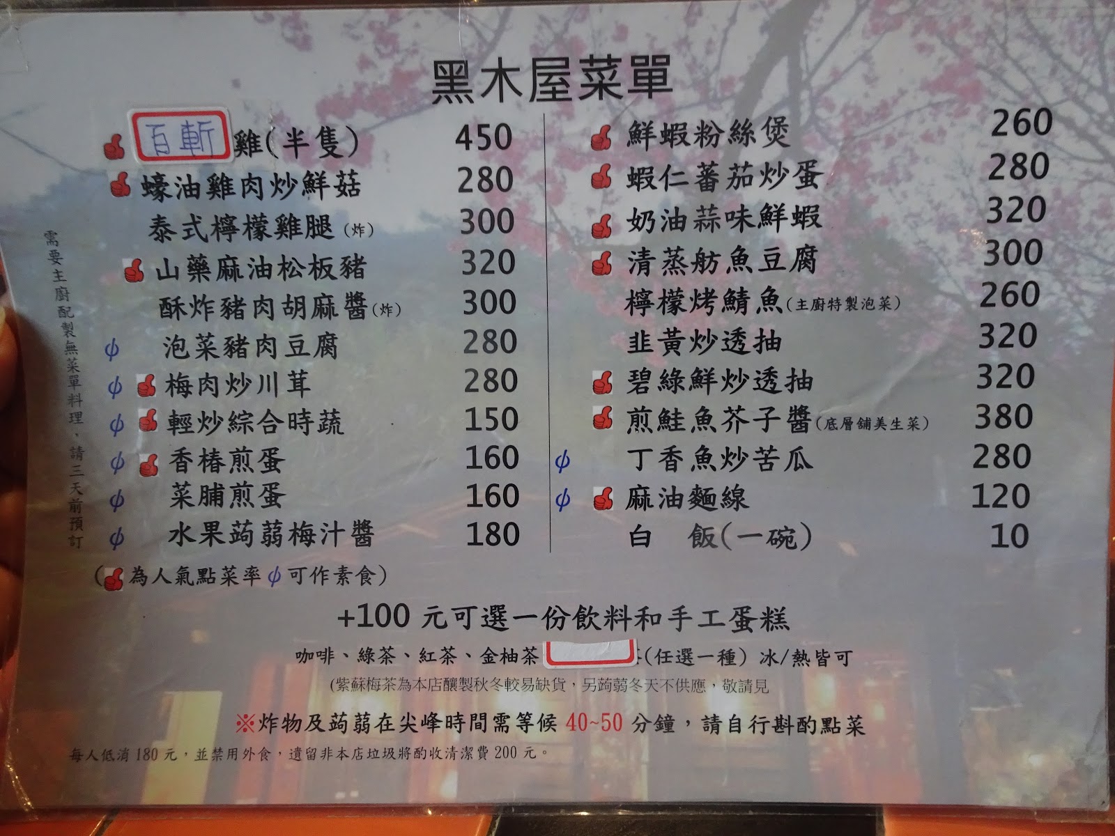 台北市北投區 - 黑木屋 陽明山是都市人的後花園,竹子湖是有景觀有美食的桃花源,這一次來尋覓美食,剛好喵到黑木屋,黑木屋的地理位置居高臨下,它的菜餚傳統中帶有創意,值得推薦! 地址:台北市北投區竹子湖路52號 電話:02 2862 1616 用餐還精裝潢的很有復古味道 戶外用餐區 菜單 白斬雞.普普 梅肉炒川茸.酸甜的口感還不錯 清炒綜合食疏 麻油麵線 黑木屋入口