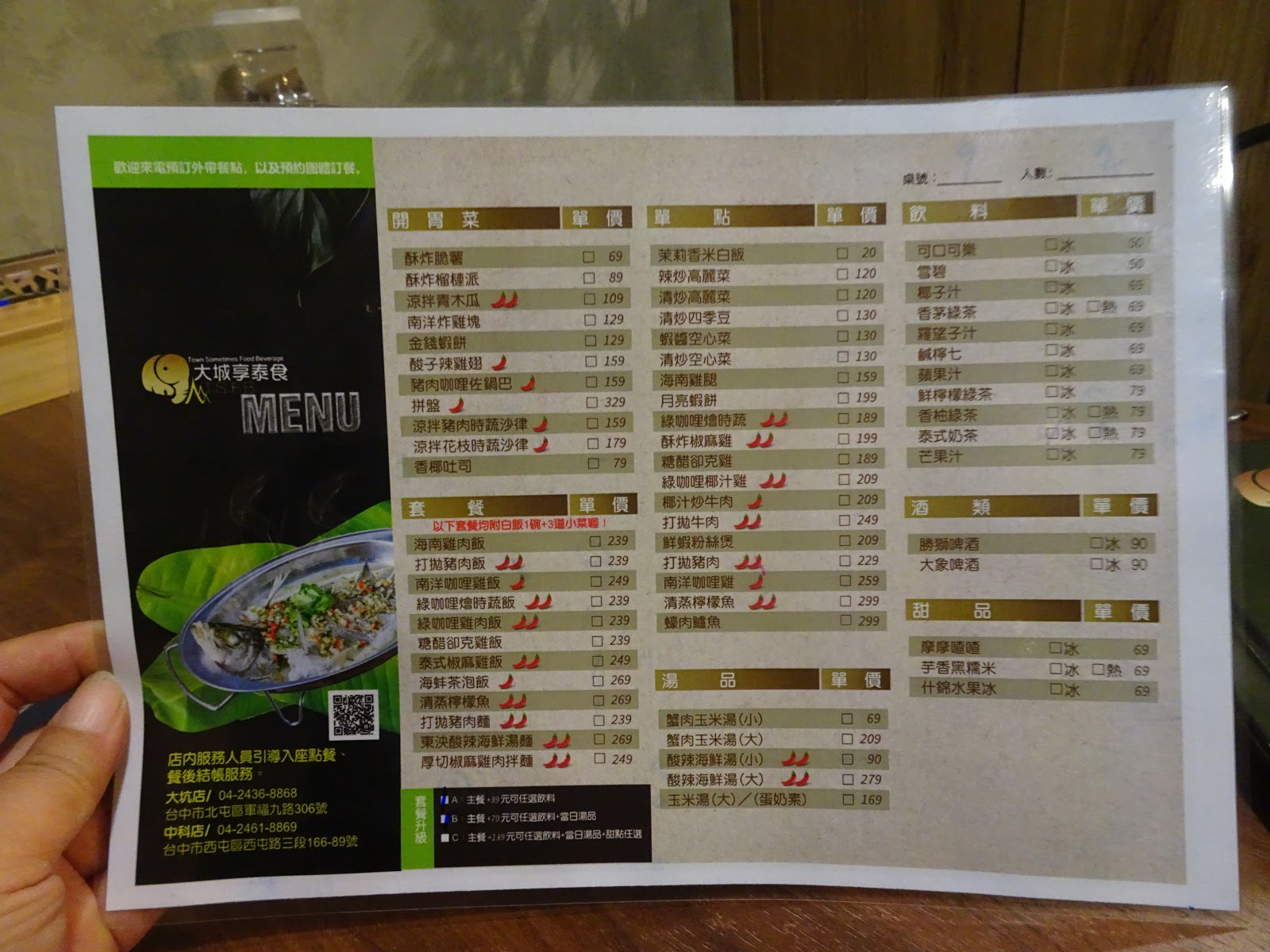 大城享泰食的菜單可以分成開胃菜、主餐、單點、飲料和甜點,而主餐又可分為飯和麵兩種均是以套餐的方式呈現(附白飯+小菜),也可享加購價的優惠+39元/飲料任選一杯、+79元/飲料+濃湯、+139元/飲料+濃湯+甜點,請依個人需要做加購。